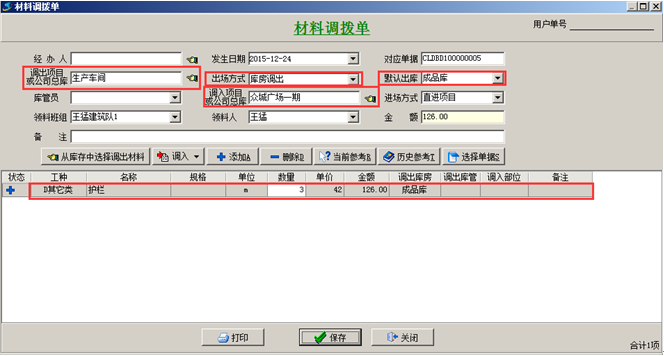 項(xiàng)目上使用產(chǎn)成品時(shí),需要從“生產(chǎn)車間”將產(chǎn)品調(diào)撥到項(xiàng)目上,在工程管理軟件中做“材料調(diào)撥單”,填寫(xiě)調(diào)撥單時(shí),調(diào)出項(xiàng)目要選擇“生產(chǎn)車間”,出廠方式選擇“庫(kù)房調(diào)出”,并選擇對(duì)應(yīng)的庫(kù)房,選擇對(duì)應(yīng)的調(diào)入項(xiàng)目以及“領(lǐng)料班組”和“領(lǐng)料人”。如圖: