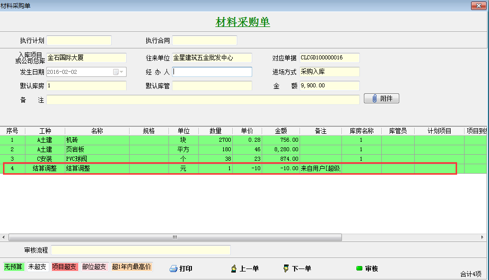 項目管理軟件設(shè)置結(jié)算調(diào)整金額時調(diào)增錄入正數(shù),調(diào)減錄入負數(shù)。供應(yīng)商優(yōu)惠10元則輸入-10,點擊確定調(diào)整完畢,此時材料采購單金額變?yōu)?900元。點擊查看,此時會發(fā)現(xiàn)材料采購單會多出一個結(jié)算調(diào)整的材料明細。如下圖: