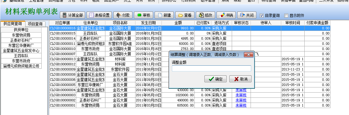 項目管理軟件在成本結(jié)算時,供應(yīng)商總會對一些價格進行一些優(yōu)惠或者對總金額零頭進行抹去,這時就需要用到結(jié)算金額調(diào)整。該功能一般適用于單據(jù)已審核,或者需要掛賬結(jié)算時使用。