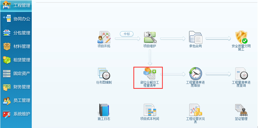 在《金石工程項(xiàng)目管理軟件》中,進(jìn)入導(dǎo)航【工程管理】->【部位分解及工程量清單設(shè)置】進(jìn)行分解操作,如下圖:
