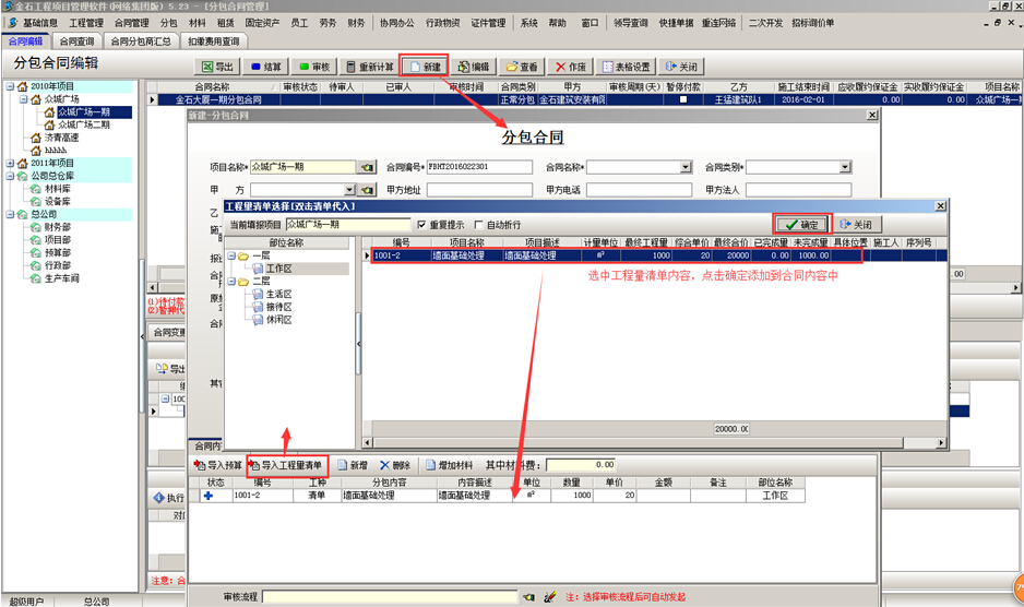 (2)分包的工程通過【分包管理】中做【分包驗(yàn)收單】來實(shí)現(xiàn)。正常的分包驗(yàn)收要有分包合同。在做分包合同時(shí)可引用部位分解里的清單,如下圖: