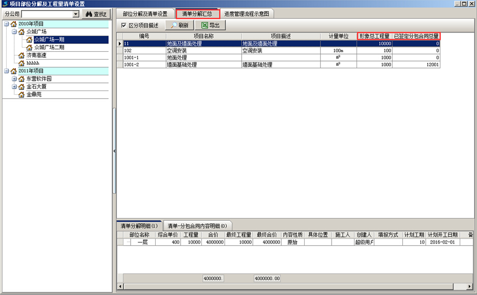 項(xiàng)目進(jìn)度查詢時(shí),系統(tǒng)會(huì)根據(jù)項(xiàng)目部分以及工程量清單匯總項(xiàng)目進(jìn)度。如圖:
