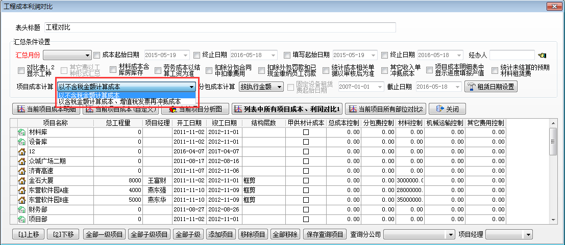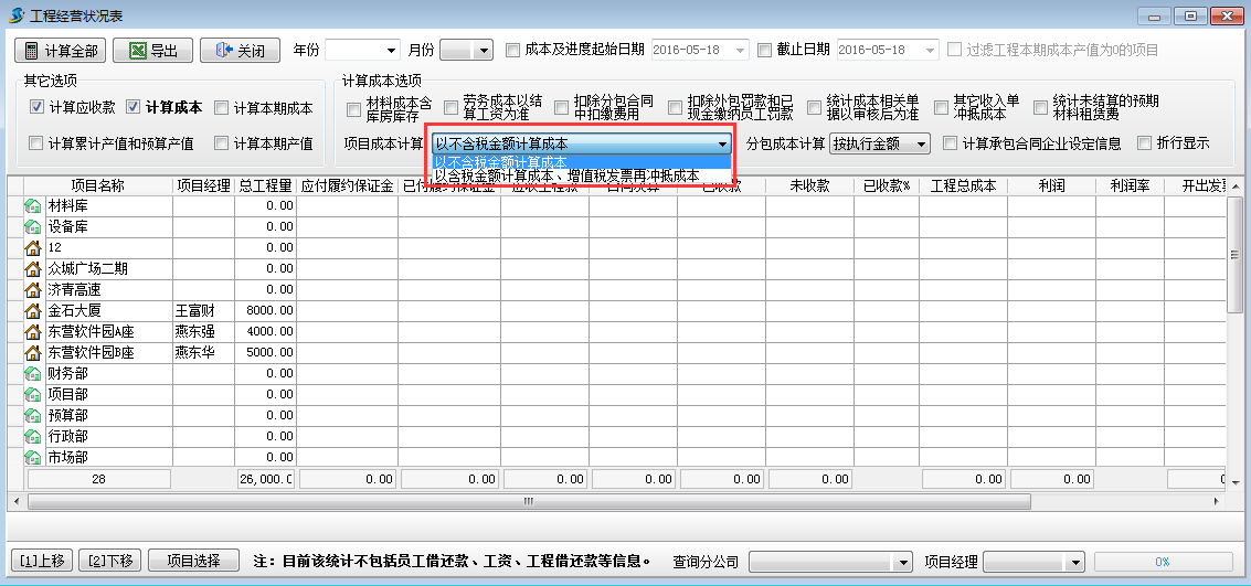 ⑵.營改增后項目成本利潤和工程經(jīng)營狀況表可以選擇以“不含稅金額計算成本”或者“以含稅金額計算成本、增值稅發(fā)票在沖抵成本”兩種方式。如下圖: