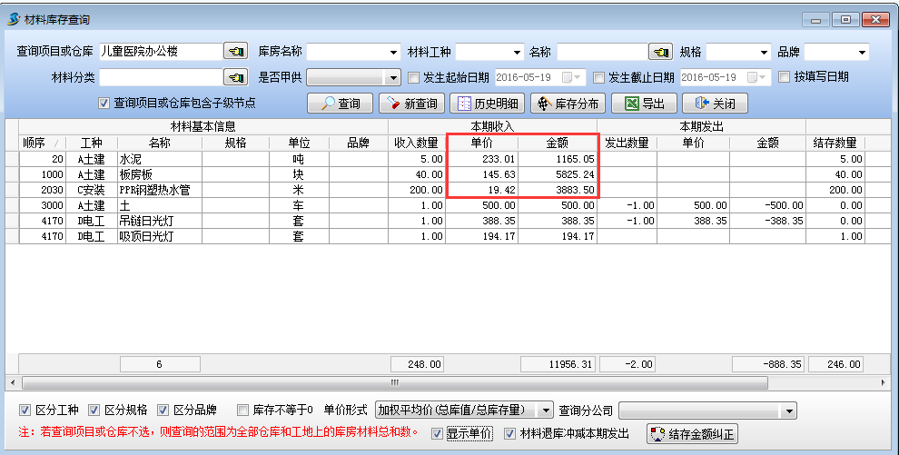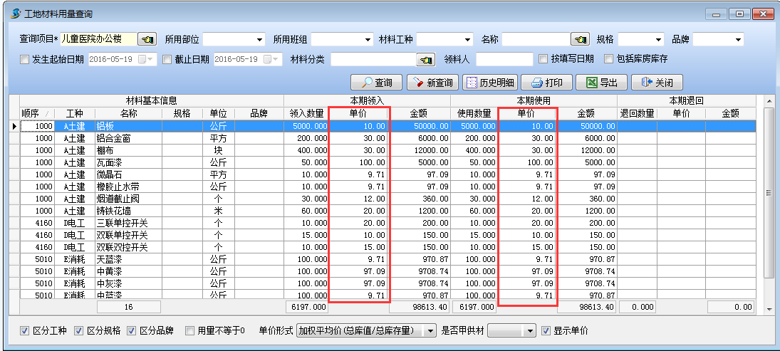 ⑴.庫存查詢和用量查詢以不含稅單價和金額統(tǒng)計。如下圖: