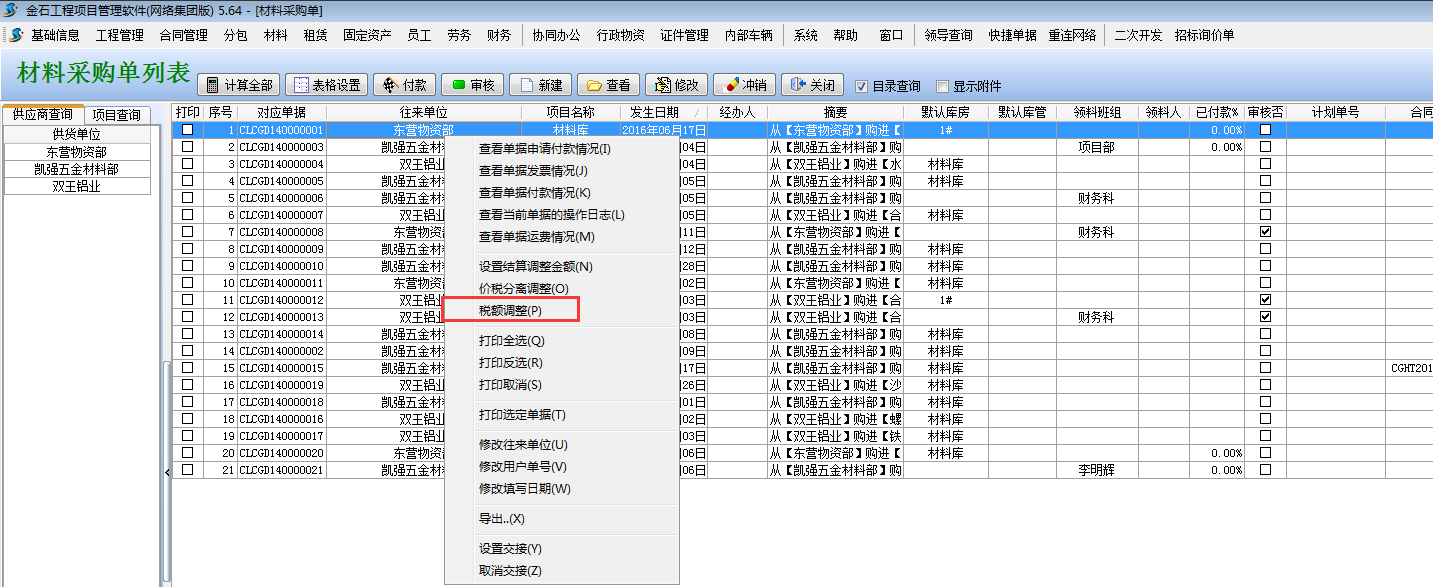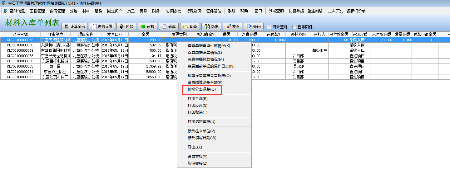 通過工程項目管理軟件價稅分離后,分離出的稅額可能與實際的稅額有一定的誤差,可通過選定單據(jù)右鍵選擇稅額調(diào)整,實現(xiàn)對稅額的調(diào)整。如下圖: