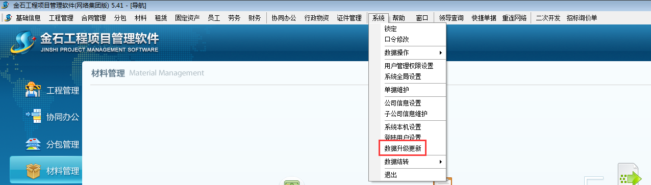 備注:升級到最新版本后,需要登錄超級用戶點擊主菜單【系統(tǒng)】-【數(shù)據(jù)升級更新】。如下圖: