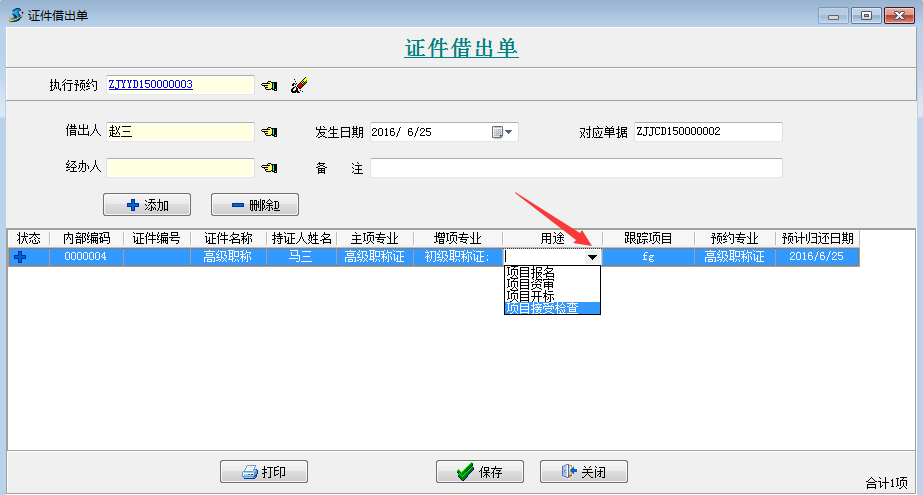 證件借出單可以選擇執(zhí)行我們上一步所演示的預(yù)約和需要跟蹤的項目