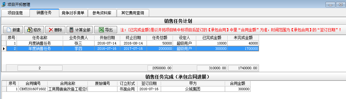 如上圖建立一個業(yè)務(wù)負責人為李四,任務(wù)總額為2000000的年度銷售任務(wù)。其中[已完成金額]是以開拓項目轉(zhuǎn)中標項目后簽訂的【承包合同】中里的“合同金額”為準,時間范圍為【承包合同】的“簽訂日期”![未完成金額]是[任務(wù)金額]減去[已完成金額]得出的金額。具體操作如下: