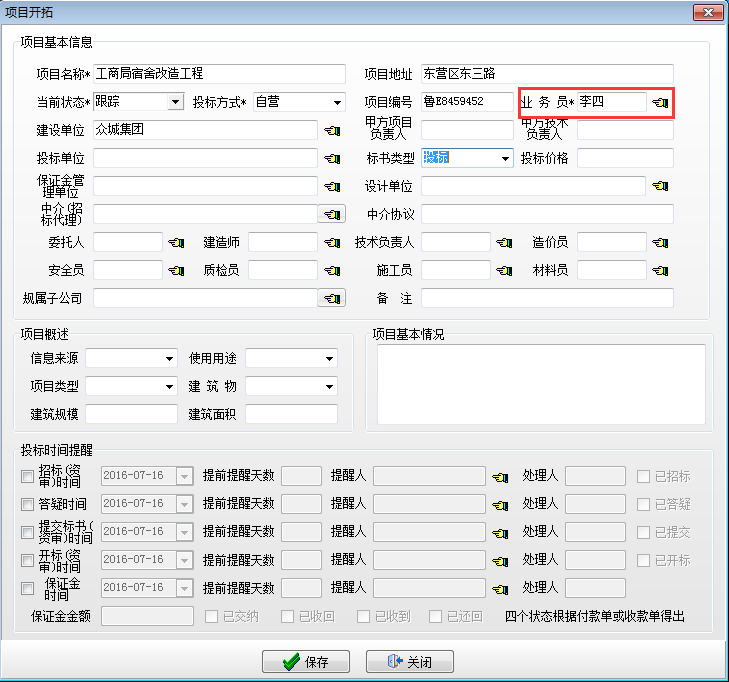 在施工項目管理軟件項目開拓建立開拓項目,【項目開拓】中業(yè)務(wù)員必須要與【銷售任務(wù)】中業(yè)務(wù)負責人一致。如下圖: