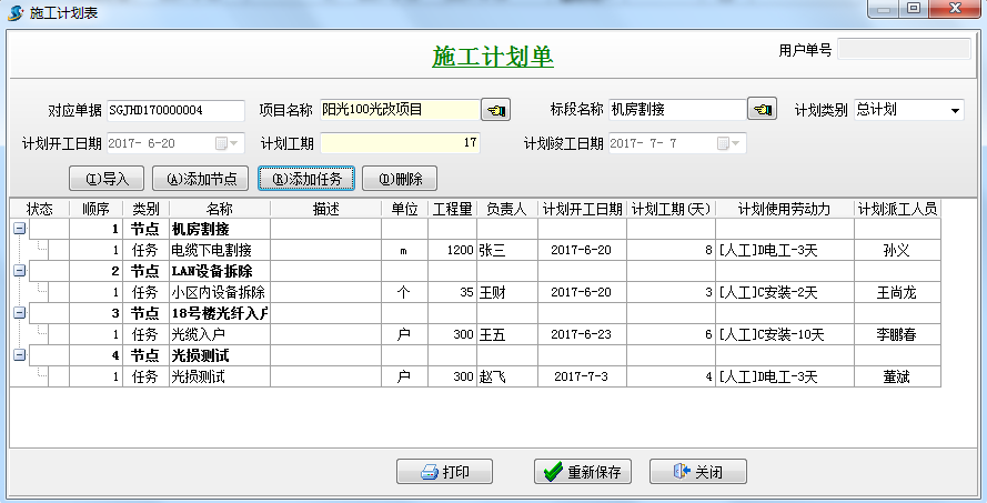 新建【施工計劃單】,先添加節(jié)點(diǎn),在添加任務(wù),輸入工程量、負(fù)責(zé)人、計劃開工日期等信息