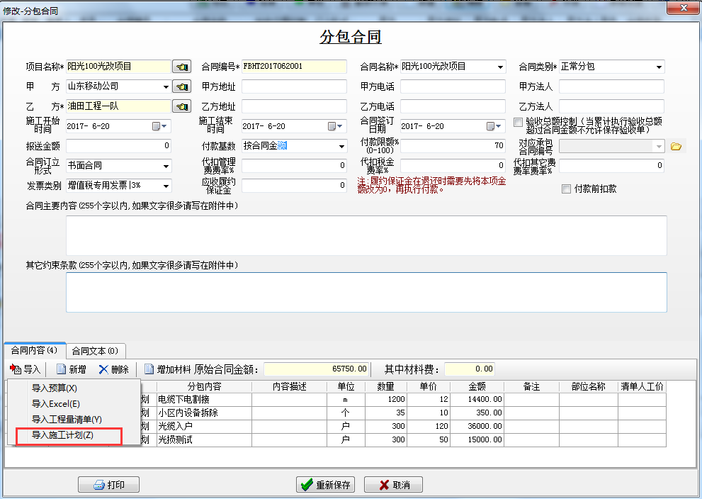 建立分包合同,導(dǎo)入施工計劃的內(nèi)容