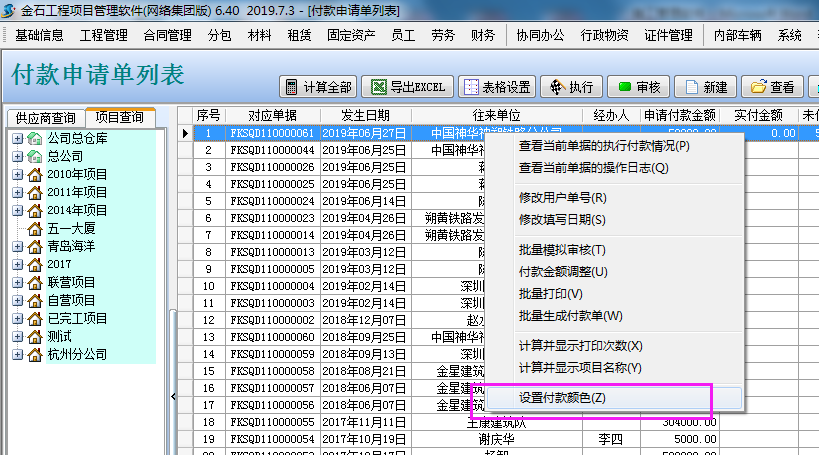 1、升級(jí)施工管理軟件最新版后,“財(cái)務(wù)管理”→“付款申請(qǐng)單列表”點(diǎn)擊鼠標(biāo)右鍵,選擇“設(shè)置付款顏色”