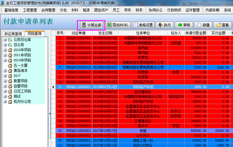 設(shè)置完成后點(diǎn)付款申請(qǐng)單列表中的“計(jì)算全部”這樣系統(tǒng)就會(huì)根據(jù)我們的設(shè)置彈出不同的顏色,就能快速的找到哪些沒有執(zhí)行付款、哪些已經(jīng)付款完成、哪些部分執(zhí)行付款。