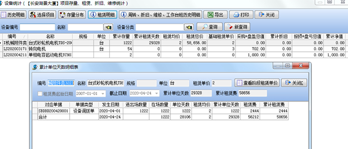 同時,已經(jīng)生成的各種信息,可以在【外包機械明細查詢】模塊查詢所有的機械往來明細。