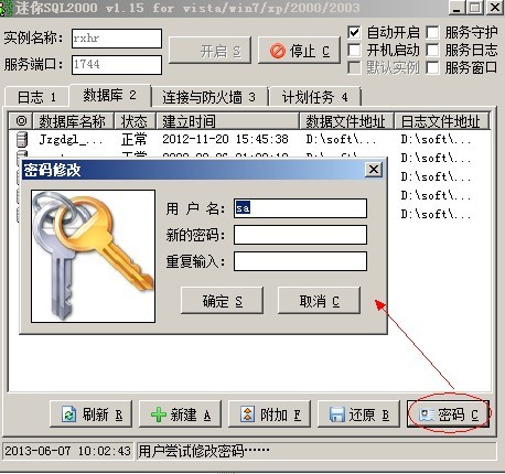 在服務(wù)器端,到第二選項(xiàng)卡數(shù)據(jù)庫中,在右下角有一個修改密碼按鈕,