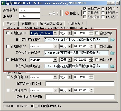 打開服務(wù)器端,到第四選項(xiàng)卡計(jì)劃任務(wù)中,選擇好需要備份的數(shù)據(jù)庫名稱、