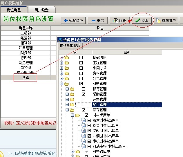 保存之后 ,選擇該崗位,再來(lái)設(shè)置這個(gè)崗位角色的【權(quán)限】。