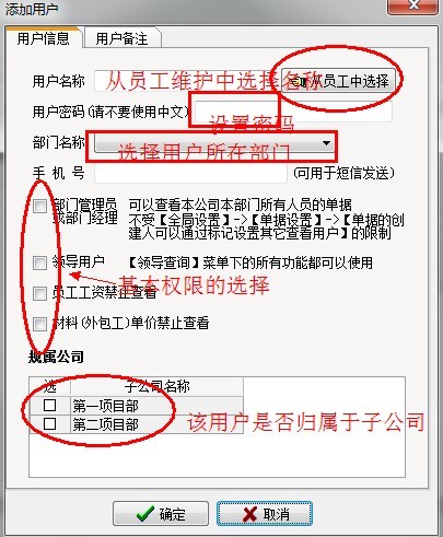 點(diǎn)擊添加用戶(hù),在彈出的窗口中,依次添加好用戶(hù)信息,主要包含用戶(hù)名、密碼、所屬部門(mén)、所屬公司等。