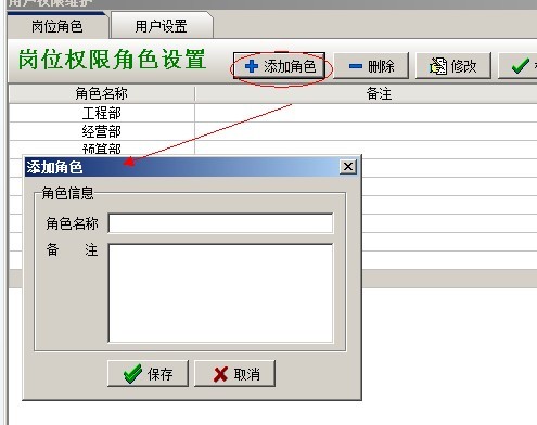 按【添加角色】按鈕,在彈出的窗口中設(shè)置崗位名稱(chēng)及備注說(shuō)明。