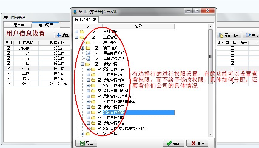 點(diǎn)擊【用戶(hù)管理權(quán)限設(shè)置】在彈出的窗口中來(lái)設(shè)置用戶(hù)操作權(quán)限。