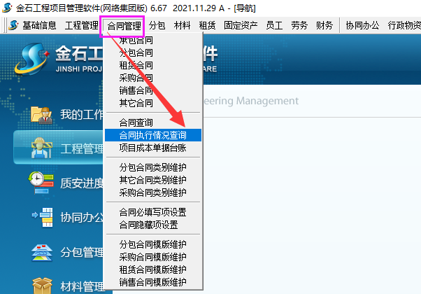 操作步驟:菜單欄→合同管理→合同執(zhí)行情況查詢