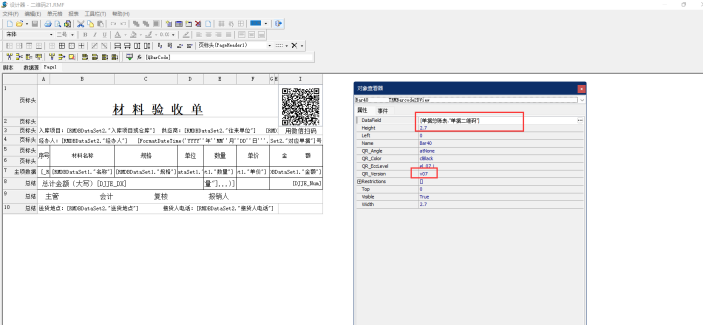 3、設(shè)置好二維碼樣式之后右鍵點(diǎn)擊單元格,點(diǎn)擊屬性。設(shè)置字符來源(datafield)為“[單據(jù)總賬表."單據(jù)二維碼"]”,二維碼版本(QR_vesion)為:v07