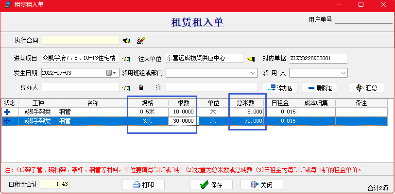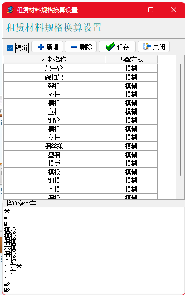 【租賃材料規(guī)格換算設(shè)置】可實現(xiàn)自定義指定某些租賃材料的總長度換算、總面積換算、重量換算,并可以自動去掉多余的字。
