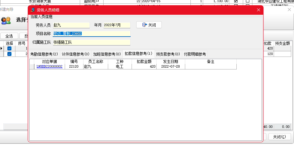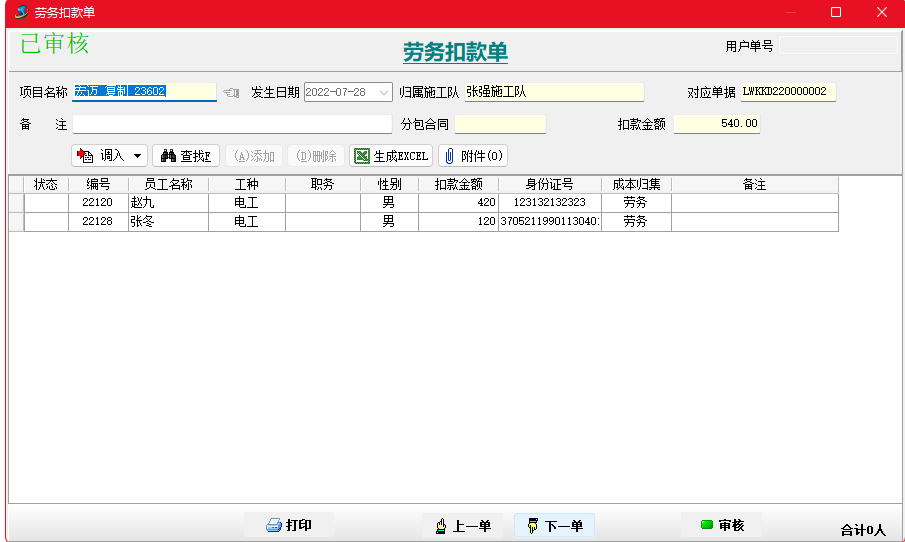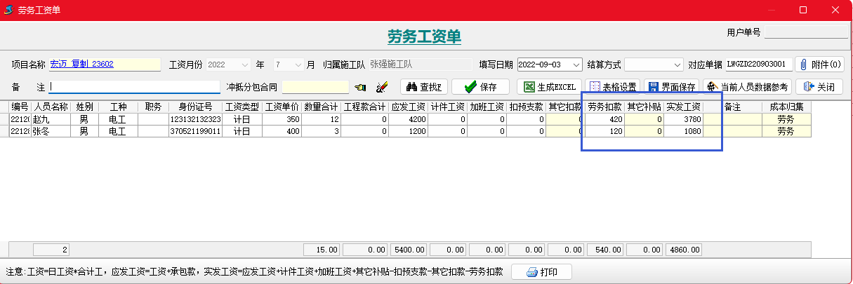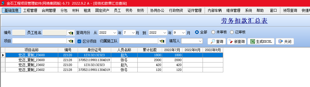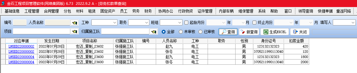 金石項(xiàng)目管理軟件增加勞務(wù)扣款單,可以按人填寫勞務(wù)工人扣款信息,并生成勞務(wù)工資表。