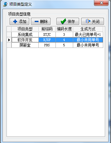 ①點“添加”按鍵增加豎列; ②“項目類型”輸入需要的項目類型; ③“前綴碼”列輸入自動流轉(zhuǎn)的項目編號; ④“編碼長度”列為不含前綴的數(shù)值長度;