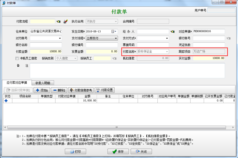 交納投標(biāo)保證金時(shí)填寫“付款申請(qǐng)單”或者“付款單”,(如果填寫的是付款申請(qǐng)單則在付款申請(qǐng)單審核通過之后進(jìn)行付款),如圖:
