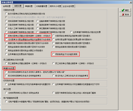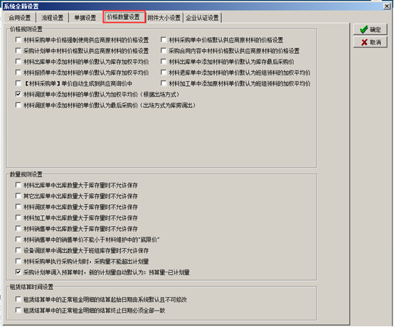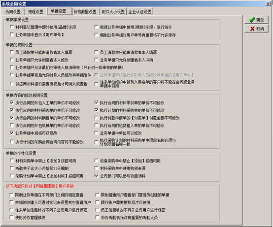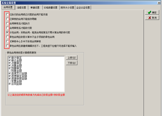 進入系統(tǒng)的“系統(tǒng)維護”-“系統(tǒng)全局設置”彈出系統(tǒng)全局設置的對話框,點擊“合同設置”,在對應的復選框打鉤代表合同受對應開關(guān)的控制,如圖: