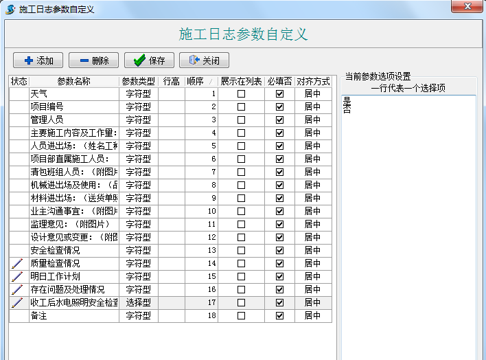 ①點(diǎn)“添加”按鍵增加豎列; ②在“參數(shù)名稱”列輸入需要的內(nèi)容; ③“參數(shù)類型”列選擇類型,其中“字符型”可輸入文字和數(shù)值、 “選擇型”可以如下圖中顯示一行代表一個選擇項(xiàng),只可選擇不能輸入 、“數(shù)值型”只能輸入數(shù)值,不能輸入文字內(nèi)容 、 “布爾型”則是勾選選擇型; ④“順序”列調(diào)整自定義項(xiàng)的先后排序 。