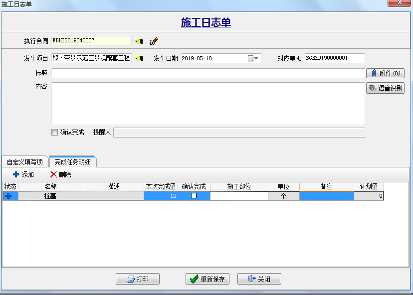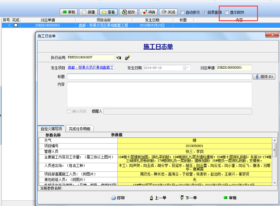 三、填報“施工日志單”根據(jù)自定義的字段 輸入相對應(yīng)的內(nèi)容,點(diǎn)下圖中的“顯示附件”添加施工現(xiàn)場的圖片。