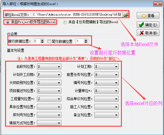 上圖為來自project軟件導(dǎo)出的excel格式。在進(jìn)度管理中導(dǎo)入時(shí)選擇好本地excel文件,設(shè)置好首行尾行數(shù)據(jù)位置,選擇好對(duì)應(yīng)excel表中各列位置,即可選擇確定導(dǎo)入,如下圖: