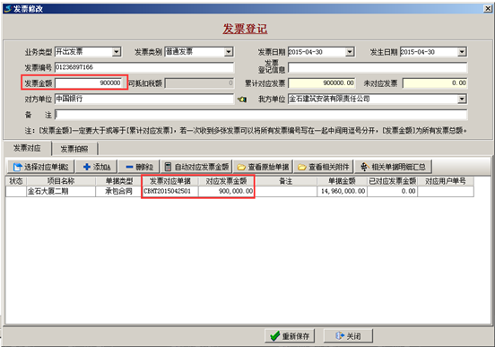 進(jìn)入“財(cái)務(wù)管理”—“發(fā)票管理”模塊添加發(fā)票信息,添加發(fā)票信息時(shí)要對(duì)應(yīng)好“單據(jù)類型”以及發(fā)票對(duì)應(yīng)單據(jù),輸入正確的發(fā)票金額。如圖: