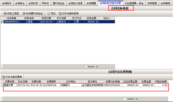 合同收款時(shí)點(diǎn)擊“合同收款及相關(guān)發(fā)票”,點(diǎn)擊“收取工程款”彈出收款單,填寫(xiě)收款單詳細(xì)信息,輸入收款金額,如果有開(kāi)發(fā)票需在“發(fā)票管理”添加發(fā)票信息并對(duì)應(yīng)好合同號(hào):