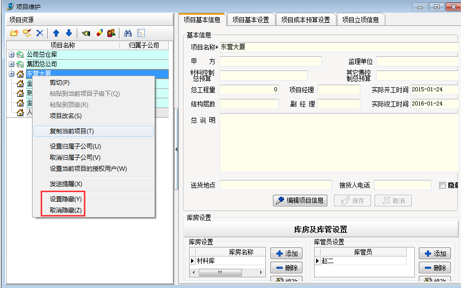 工程管理-項目維護-選中項目右鍵設(shè)置隱藏或者取消隱藏。 如下圖: