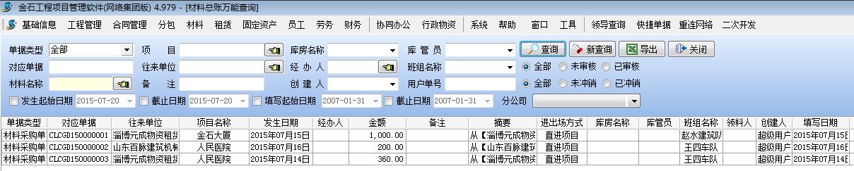 2.3.1設(shè)置項目隱藏前查詢時統(tǒng)計所有項目數(shù)據(jù),我們以材料總賬萬能查詢?yōu)槔缦聢D