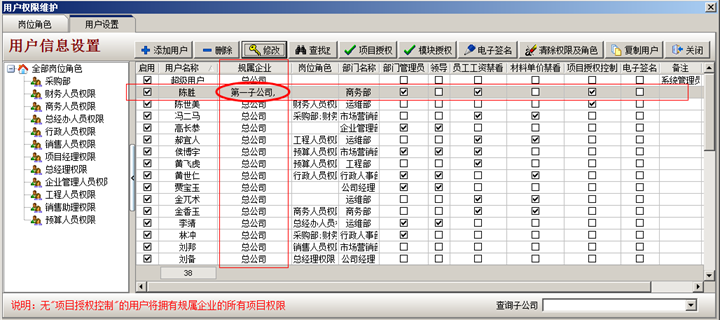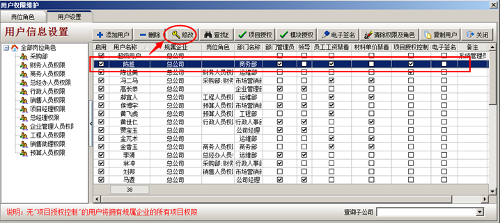 3.工程管理軟件中設置子公司員工:以員工陳勝為例講解,登錄超級用戶----系統(tǒng)維護----用戶管理權限設置。選中員工陳勝,點修改按鈕