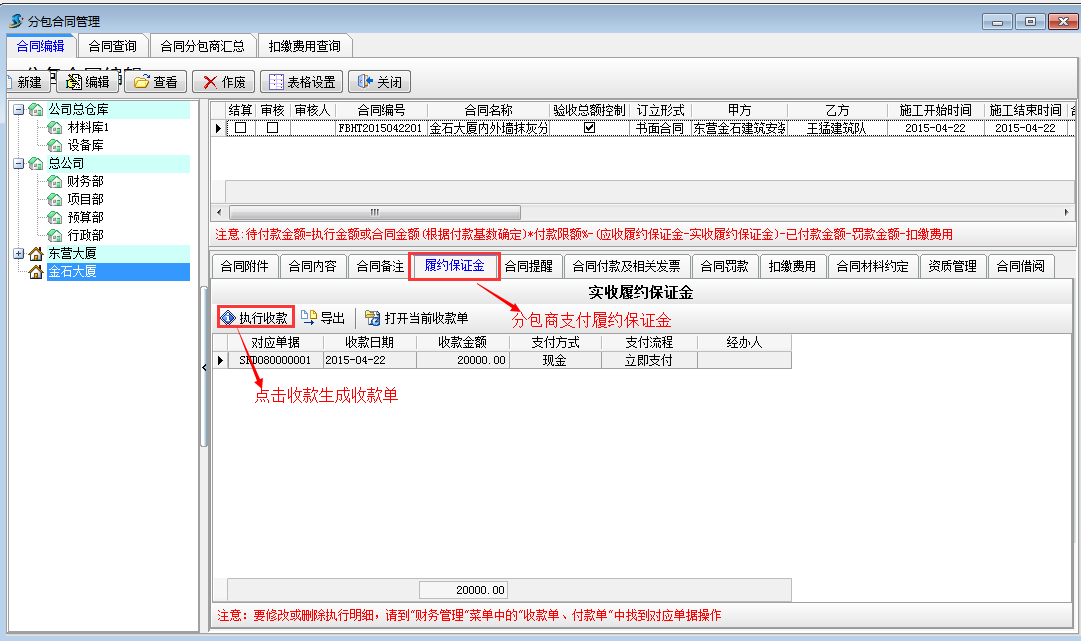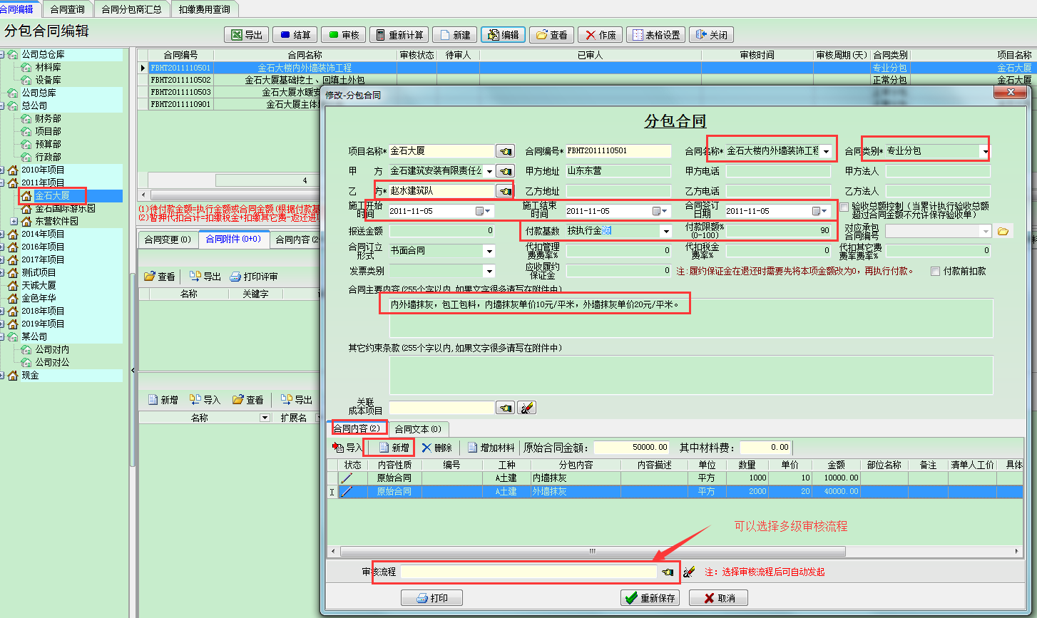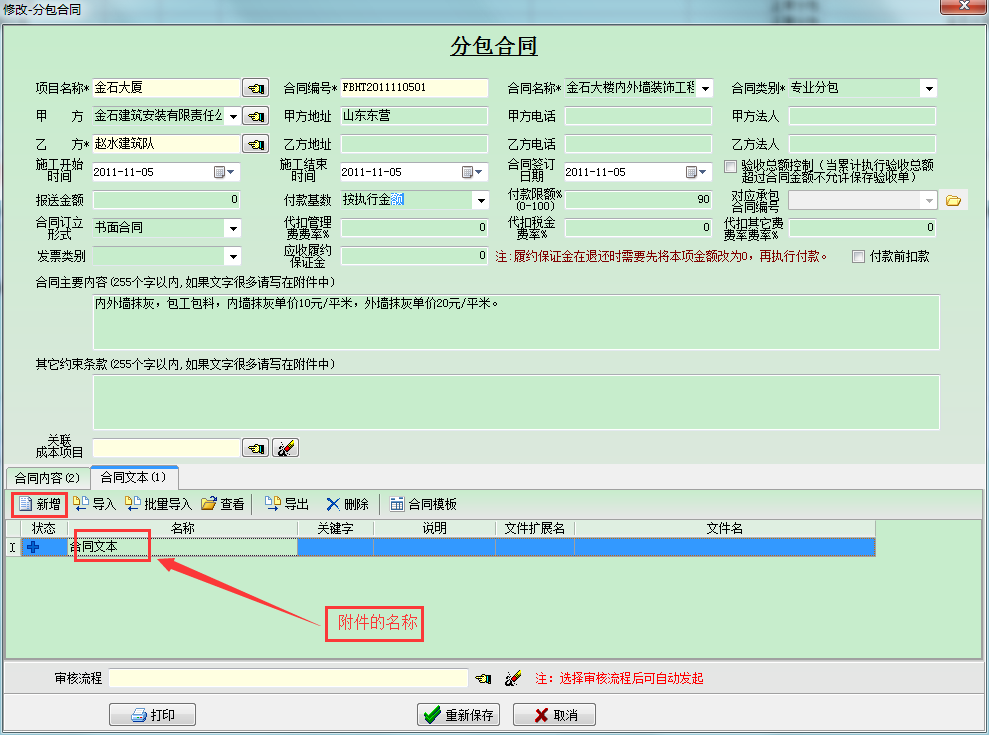 選中[金石大廈]項(xiàng)目點(diǎn)擊【新建】來(lái)建立一個(gè)合同,界面如下: