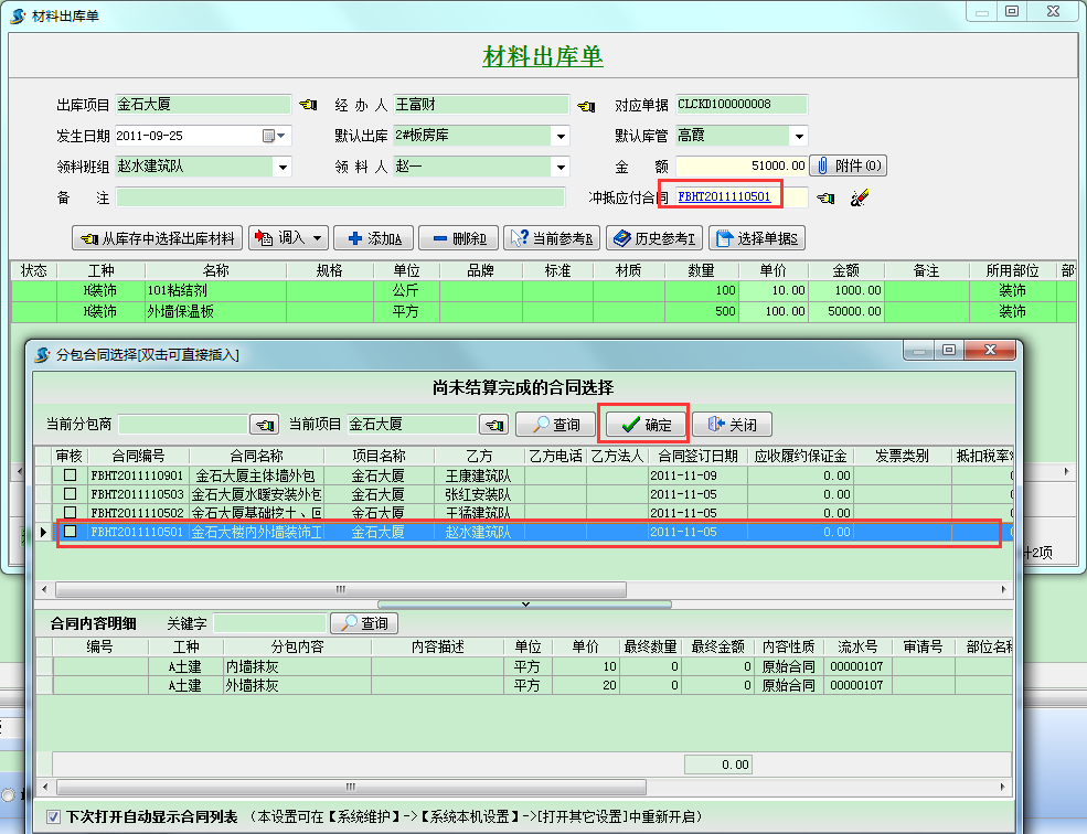 甲供材到達現(xiàn)場倉庫后,由分包商(領料班組)領走,此時做相應的出庫單,在出庫單中我們勾選沖抵應付合同,并選擇對應的分包合同,如下圖所示,