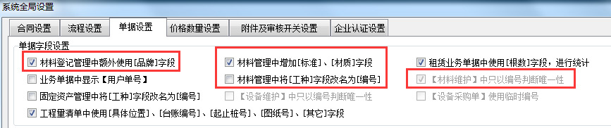 1、單據(jù)字段,比如開啟品牌,標準和材質(zhì)的字段,工種字段改為編號,還有編號為材料的判斷標準。