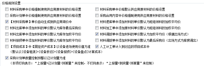 4、價格規(guī)則設置,里面包括材料計劃單、材料采購單及采購合同中材料價格幾種選擇方式,如強制使用原材料價格和默認使用原材料的價格。材料采購單單價自動生成到供應商詢價中,材料出庫單中添加材料的單價默認為庫存最后采購價,材料退庫單中添加材料的單價默認為班組領料的加權平均價,材料調(diào)撥單中添加材料的單價默認為加權平均價(根據(jù)出場方式)等開關。特別的,采購計劃單中,若以“上報量+已計劃量<預算量”來控制,需要開啟此開關。