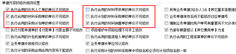 3、單據(jù)內(nèi)容修改規(guī)則設置中,描述了以下幾種情況,執(zhí)行合同的材料采購單、材料甲供單、采購計劃單、材料銷售單的單價不可修改,執(zhí)行計劃的材料采購單的單價不能修改,執(zhí)行計劃的采購合同內(nèi)容不能修改。