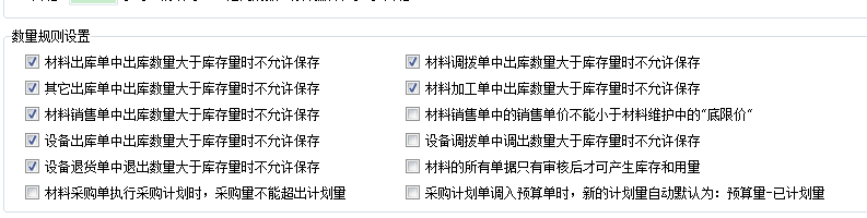 5、數(shù)量規(guī)則設置,在此開關中主要涉及,出庫數(shù)量大于庫存時是否允許保存。比如材料出庫單中出庫數(shù)量大于庫存時不允許保存。關于計劃單的開關,如材料采購單執(zhí)行采購計劃時,采購量不能超過計劃量,采購計劃單調(diào)入預算是,新的計劃量自動默認為:預算量-已計劃量。