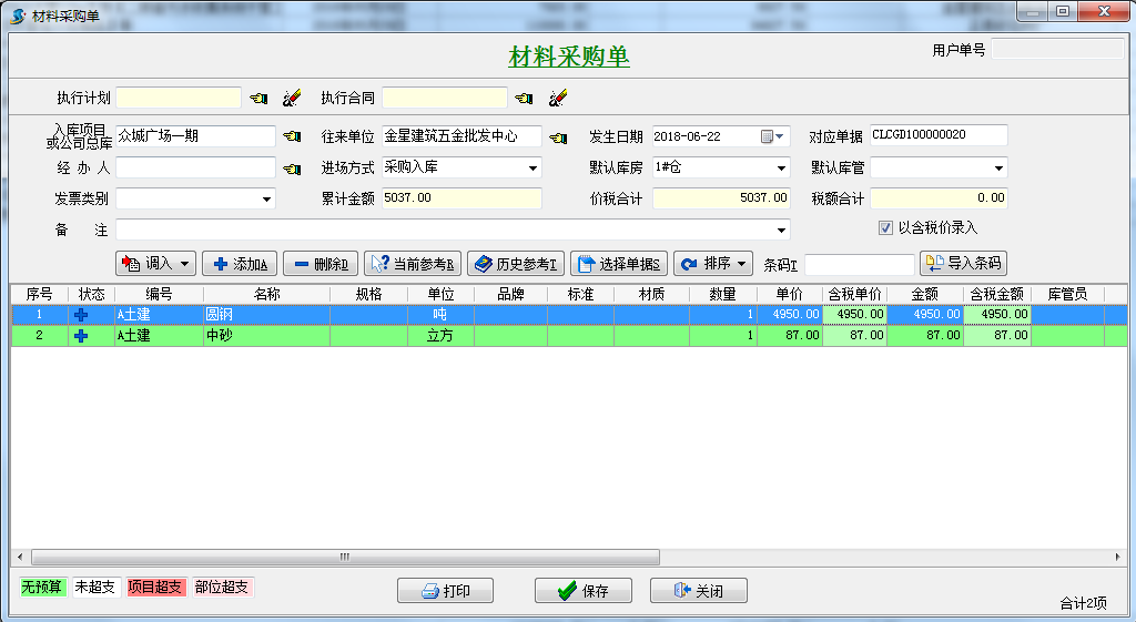 材料調(diào)入到材料采購單中之后,執(zhí)行材料采購。具體執(zhí)行流程參照第一種情況,如圖: