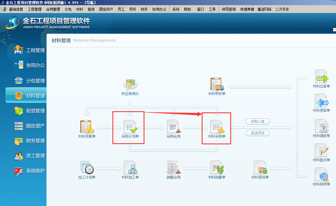 項目在工程項目管理軟件上報采購計劃,相關(guān)人員逐級審批通過,然后辦理采購,驗收入庫。(這種情況適合項目上大材批量采購,不需要簽訂供貨合同)。