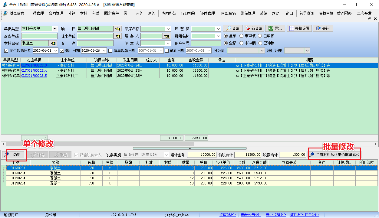 場景描述:項目上的部分材料市場價格波動較頻繁,一般是按時間段結(jié)算一次(比如一個月),月底確定材料價格,這樣在入庫時材料單價可以不寫,直接入庫,在月底時統(tǒng)一修改單價。