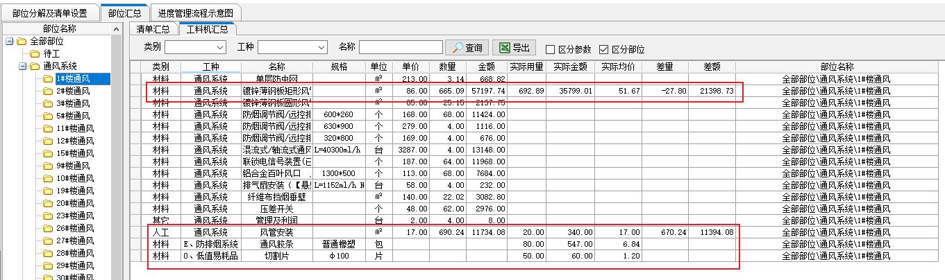 通過(guò)部位匯總這個(gè)界面,我們可以看到材料預(yù)算與實(shí)際用量的對(duì)比以及預(yù)算金額與實(shí)際金額的對(duì)比,便于實(shí)時(shí)掌控成本的發(fā)生或超預(yù)算、超預(yù)算金額的情況。