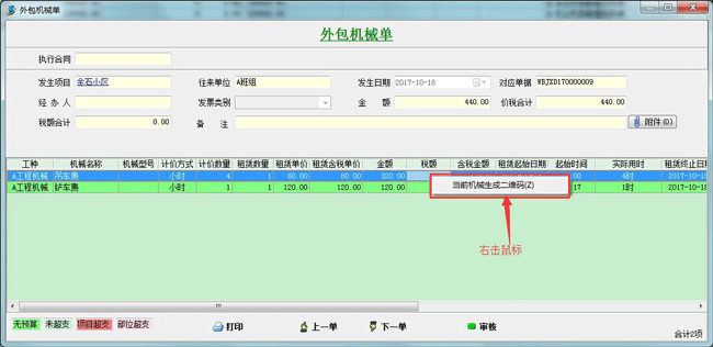 1、在最新版的金石工程項(xiàng)目管理軟件6.0中,外包機(jī)械單有一個更新,就是添加了二維碼打印的功能,如下圖